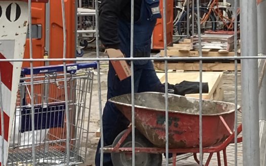 Een bouwvakker vertelt over de werkplaats waar hij naast staat.